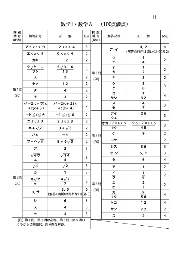 共通テスト【数学ⅠA】2020年 本試 解答
